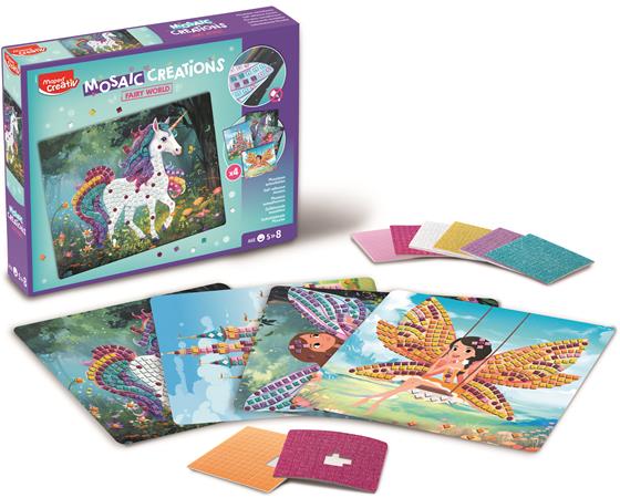 4 varázslatos kártya, amelyet öntapadó mozaikokkal lehet díszíteni. Ragaszd az öntapadó mozaikokat a képekre, hogy életre keltsd azokat. Praktikus készlet, amelyhez nincs szükség ragasztóra! A mozaikok könnyen felragaszthatók és tökéletesen alkalmasak a kis kezek számára.