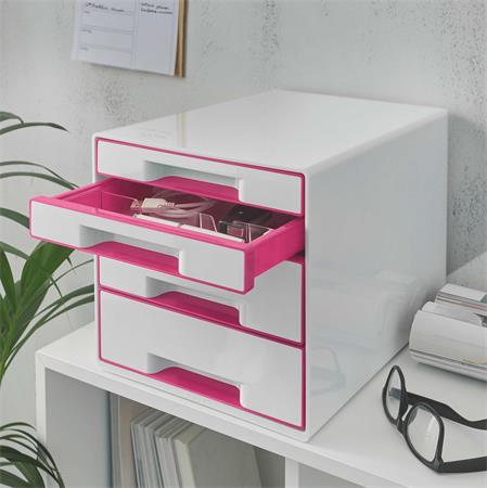 Irattároló, műanyag, 4 fiókos, LEITZ "Wow Cube", fehér/rózsaszín