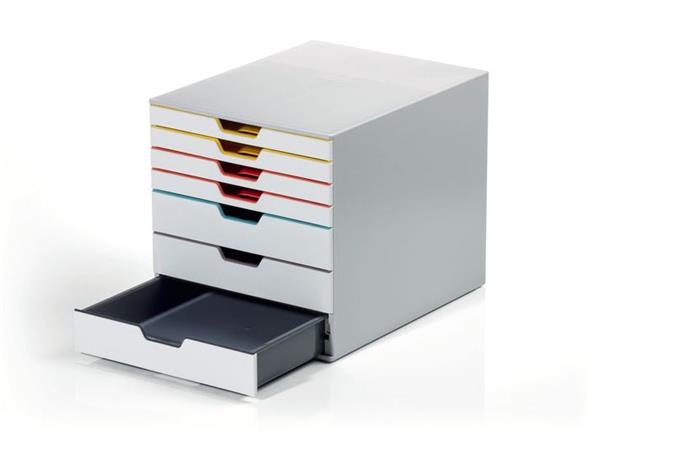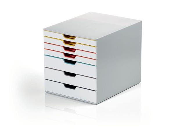 Fiókos iratrendező 7 (3 mély és 4 sekély) fiókkal és kihúzható előlappal.