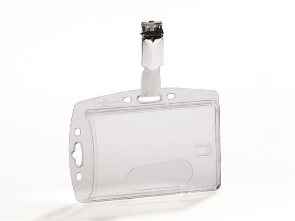 Víztiszta azonosító-, és biztonságikártya-tartó forgatható csíptetővel.