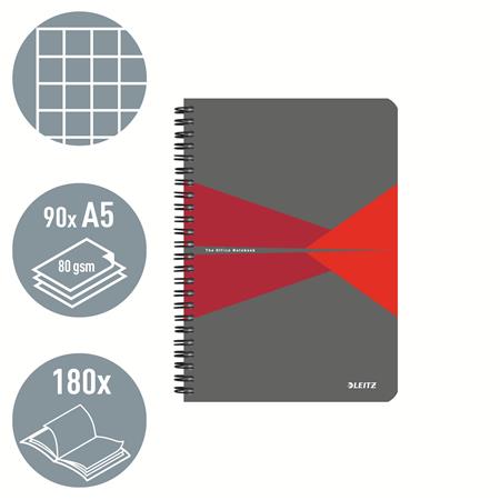 Spirálfüzet, A5, kockás, 90 lap, laminált karton borító, LEITZ "Office", szürke-piros