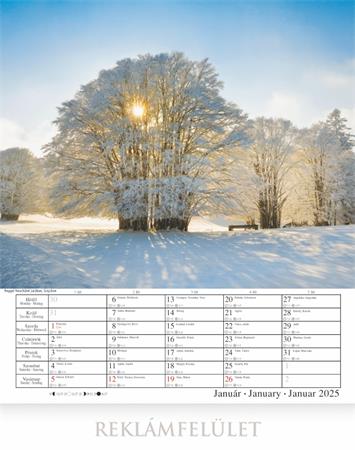 -naptár rész: magyar, angol, német nyelven, magyar  ünnepek  és névnapokkal, napkelte, napnyugta és holdállás  feltüntetésével
