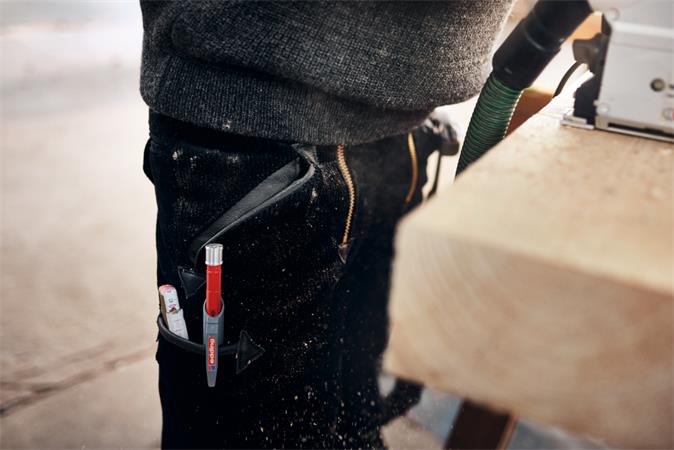 Mechanikus ácsceruza praktikus védő tokban különböző felületek, mint pl. fa, karton, kő vagy beton jelölésére.