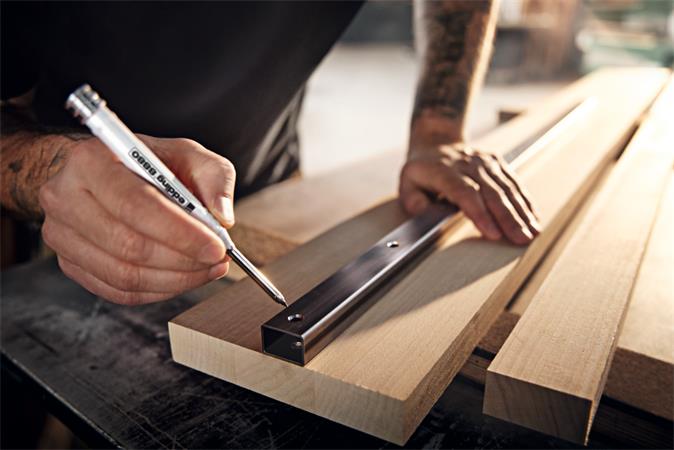 -hosszú (42 mm) és vékony (5,5 mm) hegyfoglalatnak köszönhetően a ceruza még a keskeny vagy más nehezen hozzáférhető helyeken is használható, pl. furatlyukak vagy vágó élek jelölése esetén