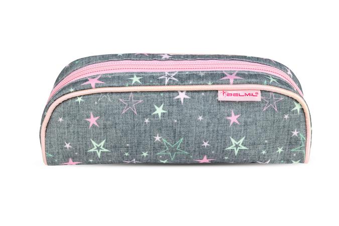 Tolltartó, henger alakú, cipzáras, BELMIL "Shine Bright", szürke-rózsaszín, csillagok