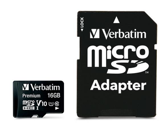 Memóriakártya, microSDHC, 16GB, CL10/U1, 45/10 MB/s, adapter, VERBATIM "Premium"