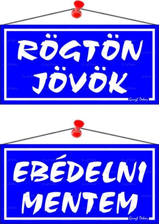 Információs tábla, 20x10,5 cm, kétoldalas, "Rögtön jövök/Ebédelni mentem", kék