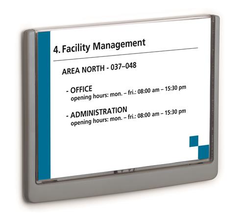 KezdőlapÜzemeltetésLétesítmény üzemeltetésInformációs és tájékoztató jelekInformációs tábla, 210x148,5 mm, DURABLE "CLICK SIGN", szürke