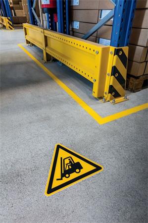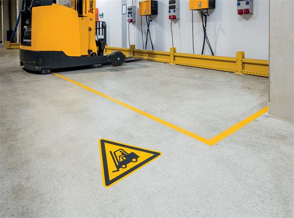 -felhasználási terület: beltéri padlóburkolatokon alkalmazható öntapadó biztonsági jel, veszélyes területek kijelölésére pl. raktárakban, disztribúciós központokban, gyártóüzemekben
